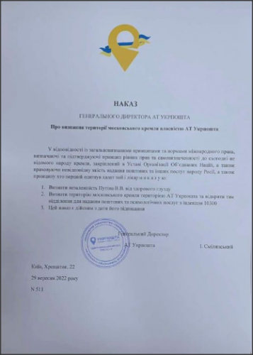 This is a genuine published order, no fake. Immediately after Russia declared the annexation of 4 Ukrainian regions yesterday, Ihor Smelyanskiy, head of Ukraine’s national postal service, Ukrposhta, issued an order declaring that the Kremlin is now the in the jurisdiction of Ukrposhta, which will be opening a post office there with a Ukrainian postal code. Echoing the ‘legality’ of the situation, Smelyanskiy’s text is a nearly verbatim copy of Putin’s annexation decree.